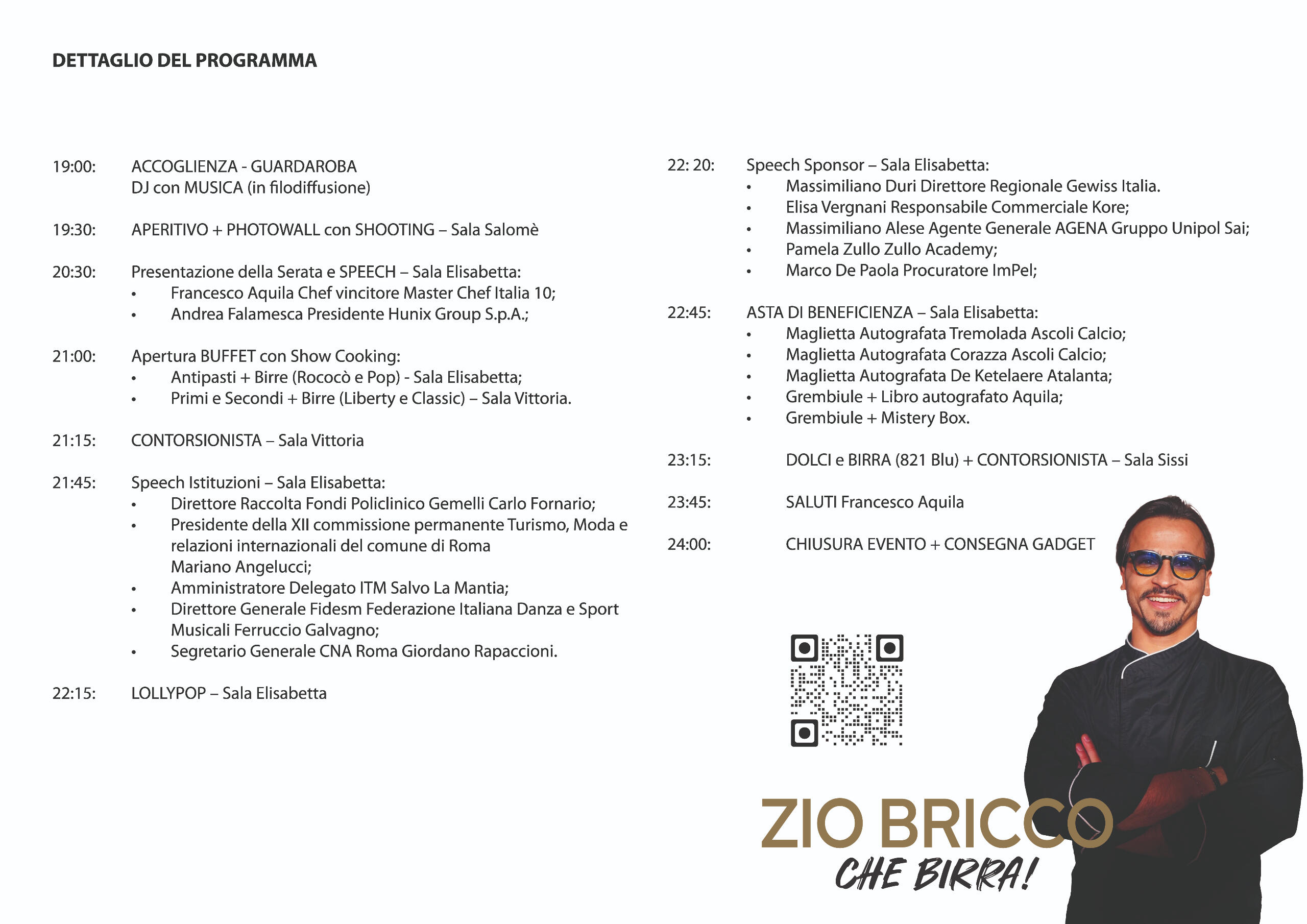 L'evento avrà inizio alle ore 19:00 e includerà una serie di attività tra cui : degustazioni, showcooking dello chef, met and greet, spettacoli di intrattenimento con performance di contorsionisti, illusionisti e ballerine.Le degustazioni hanno come obiettivo quello di presentare prodotti tipici del territorio di alta qualità abbinati alle birre prodotte dal birrificio Andrea Falconi.